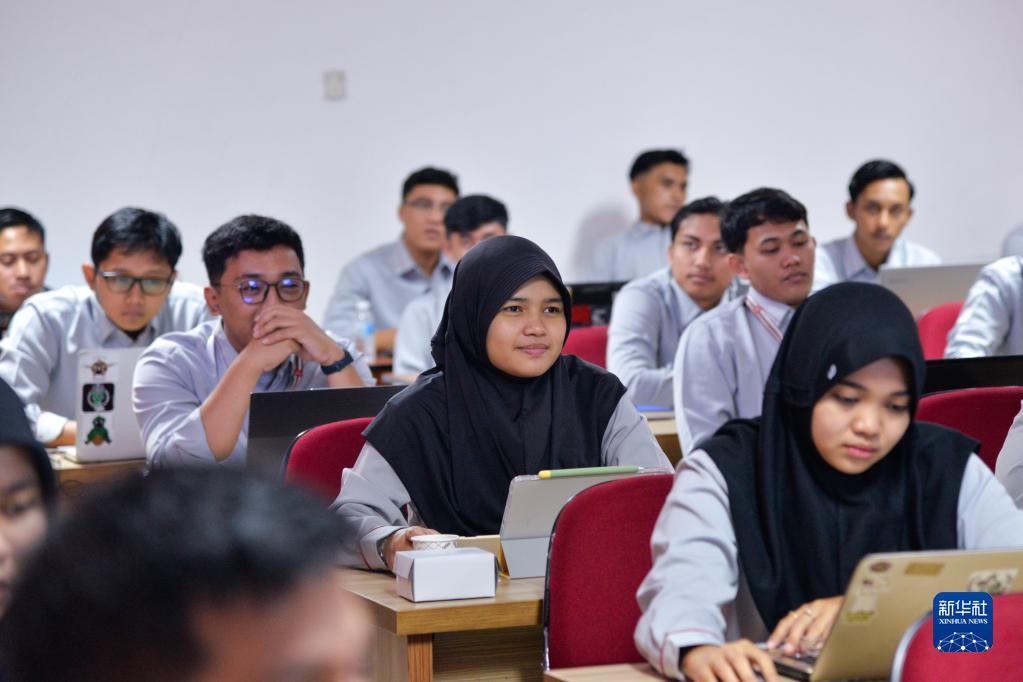 6月7日,在位于印度尼西亞茉莉芬市的印尼鐵路理工學(xué)院,應急值守人員培訓班學(xué)員尼斯麗娜(中)參加培訓。