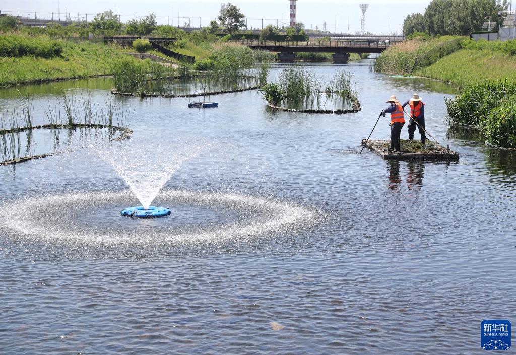 6月6日,環(huán)衛工人在秦皇島市海港區境內的排洪河清理水中雜物。