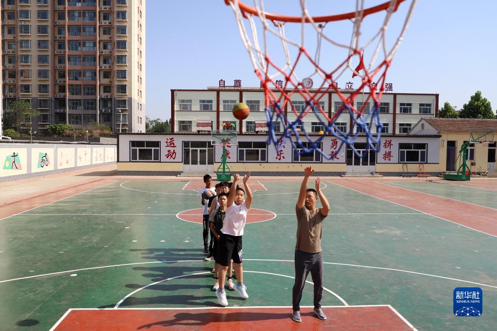 6月15日,在河北省滄州市吳橋縣新興路小學(xué),老師指導學(xué)生投籃。