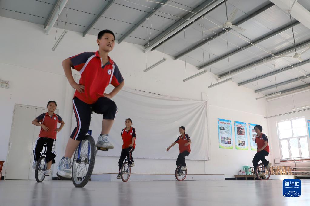 6月15日,在河北省滄州市吳橋縣馬庫吏小學(xué),學(xué)生練習雜技獨輪車(chē)。
