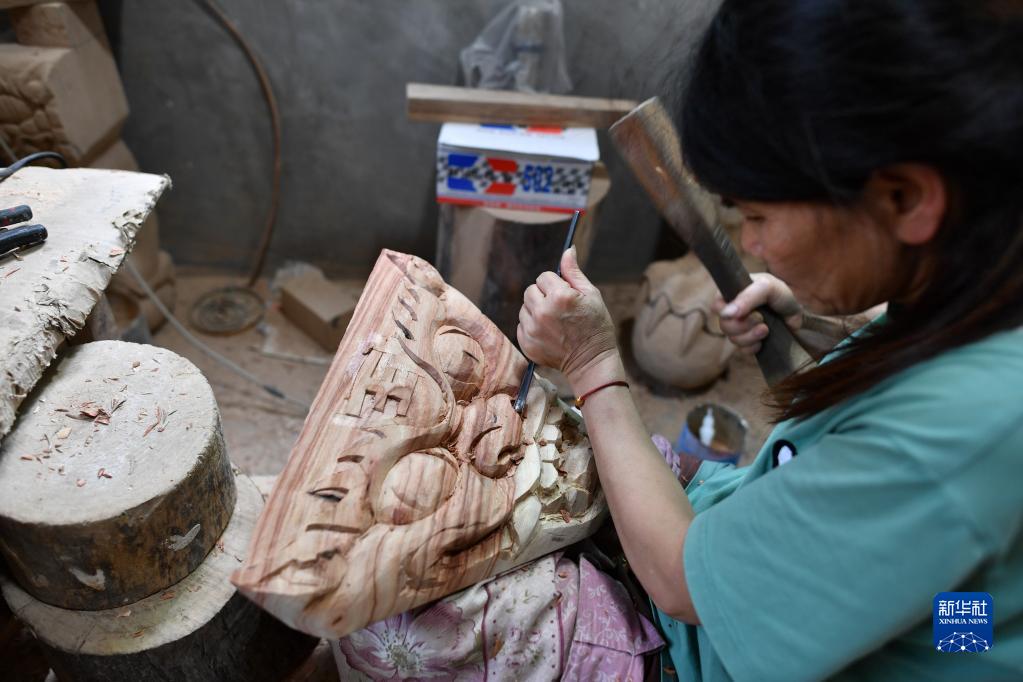 福州市閩侯縣方莊村匠人在雕刻龍舟虎頭牌(6月12日攝)。