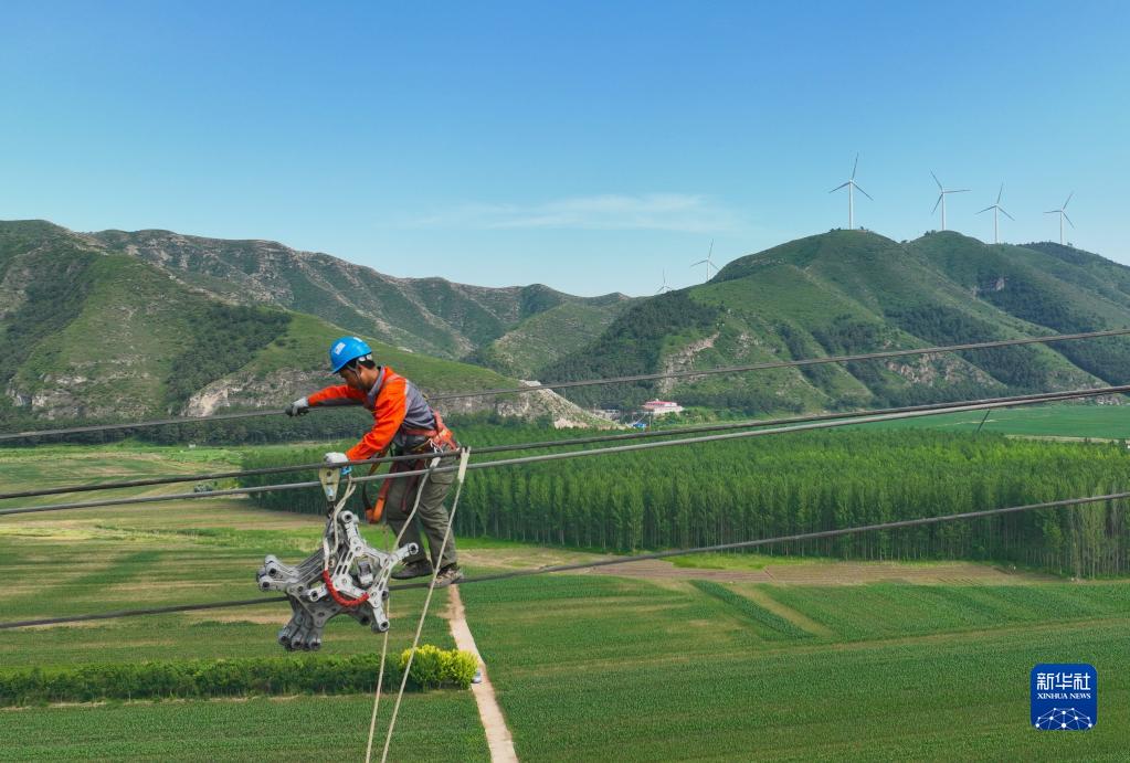 6月15日,在凌綏高速電力線(xiàn)路遷改工程現場(chǎng),國家電網(wǎng)遼寧朝陽(yáng)供電公司工程技術(shù)人員在安裝線(xiàn)上間隔棒(無(wú)人機照片)。