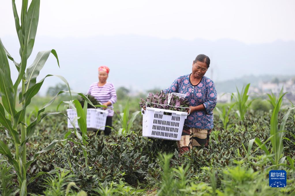 6月16日,村民在貴州省黔東南苗族侗族自治州黃平縣舊州鎮野菜種植基地搬運野菜紫背天葵。