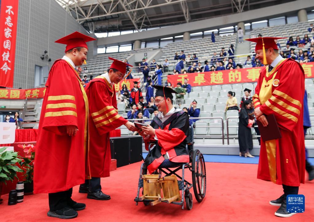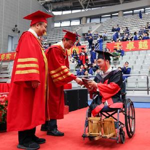 6月16日,在復旦大學(xué)2023屆研究生畢業(yè)典禮暨學(xué)位授予儀式上,數學(xué)科學(xué)學(xué)院的博士生鄭智源坐在輪椅上接受撥穗授證。下肢高位截肢的鄭智源克服身體的磨難和生活的不便,圓滿(mǎn)完成學(xué)業(yè)。