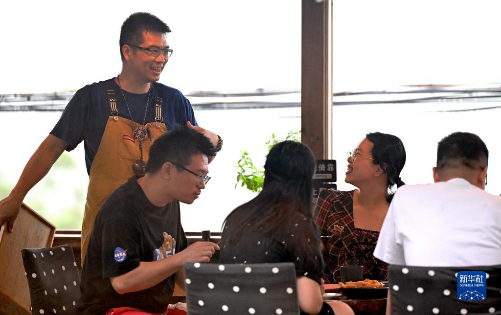 曾崇信(左一)在店里聽(tīng)取客人意見(jiàn)(6月14日攝)。
