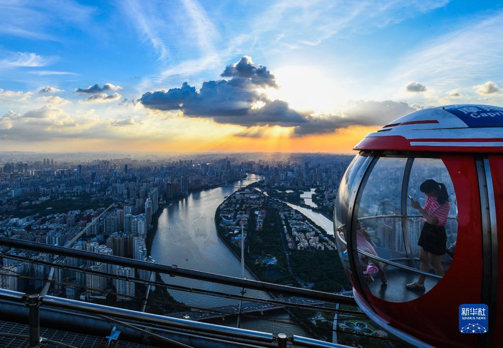 游客在廣州塔頂摩天輪觀(guān)賞珠江落日(2022年8月7日攝)。