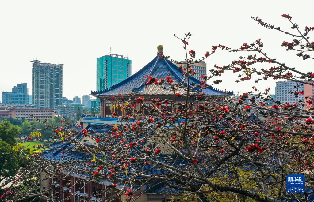 廣州中山紀念堂前,木棉花盛開(kāi)(2020年2月19日攝,無(wú)人機照片)。