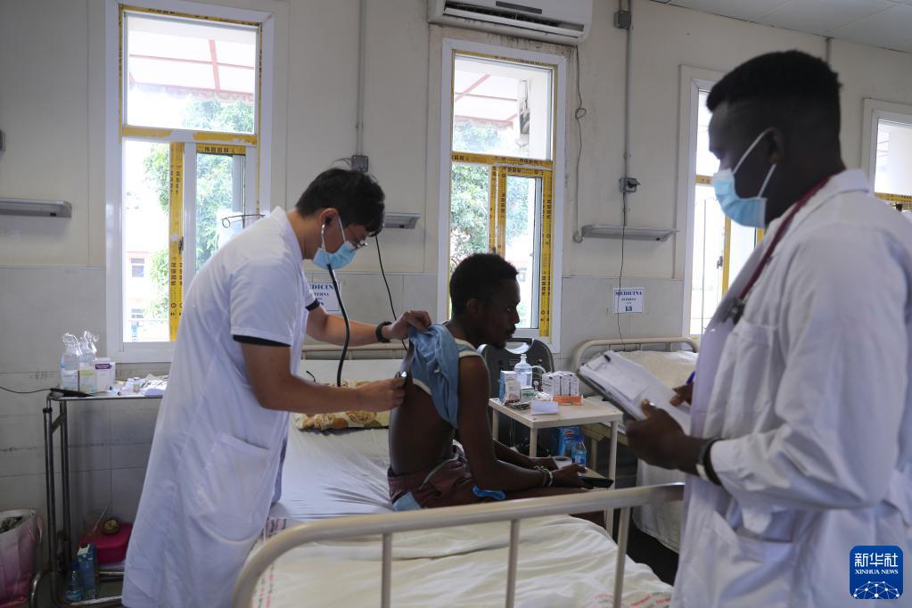 6月14日,在赤道幾內亞首都馬拉博的馬拉博地區醫院,中國醫療隊內科醫生李德炳(左)為病人檢查。