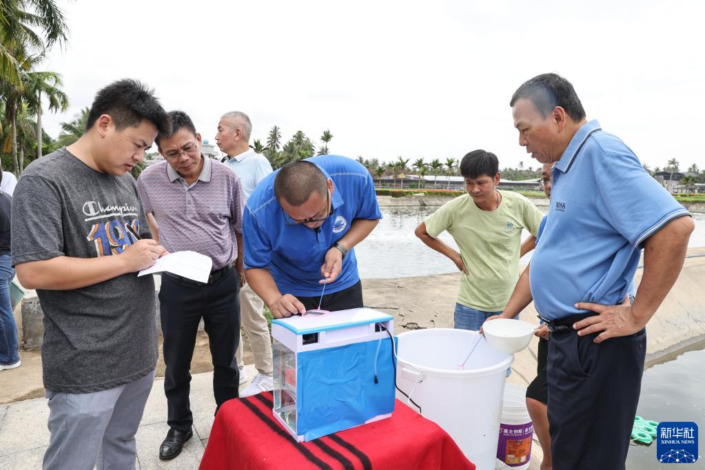 6月16日,在海南省海洋與漁業(yè)科學(xué)院瓊海長(cháng)坡科研基地,工作人員測量波紋唇魚(yú)幼魚(yú)的體長(cháng)、體高。