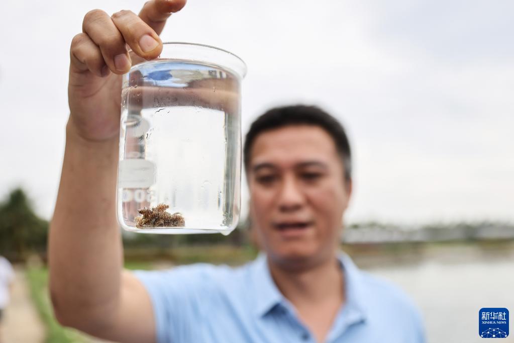 6月16日,在海南省海洋與漁業(yè)科學(xué)院瓊海長(cháng)坡科研基地,工作人員展示波紋唇魚(yú)幼魚(yú)。