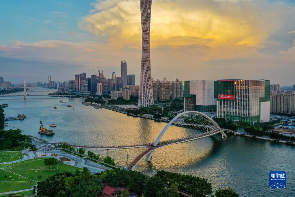 行人在廣州海心橋上經(jīng)過(guò)(無(wú)人機照片,6月10日攝)。