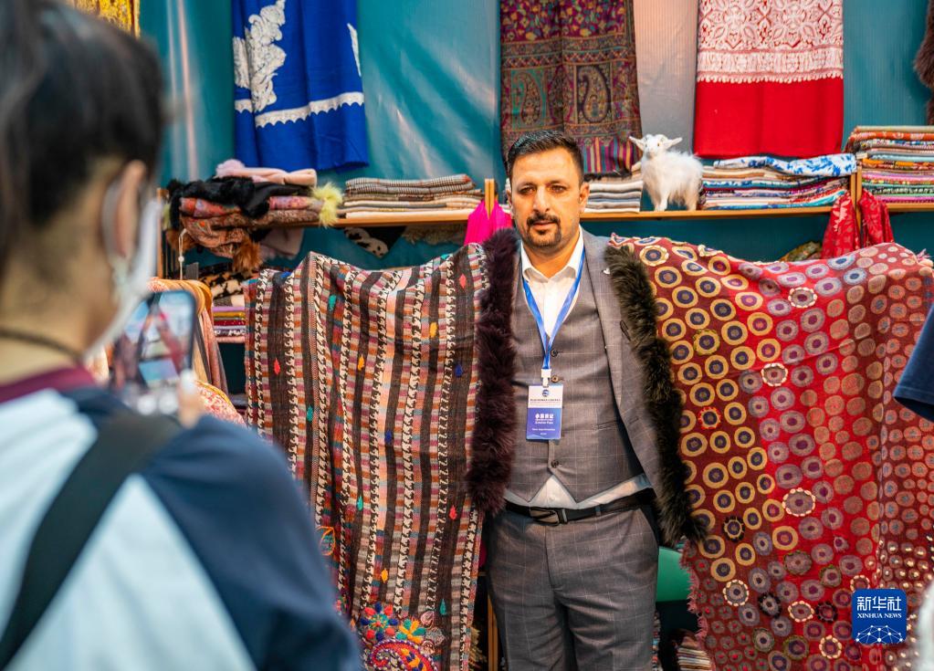 6月17日,來(lái)自印度的參展商在第五屆藏博會(huì )現場(chǎng)向顧客展示披肩。