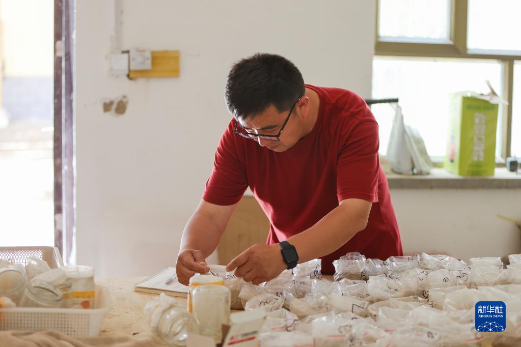 在中科院新疆生態(tài)與地理研究所策勒沙漠研究站,買(mǎi)爾當在查看土壤樣本(6月13日攝)。新華社記者 郝昭 攝