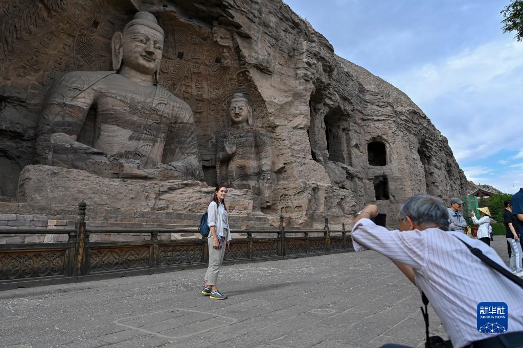 一位外國游客在云岡石窟拍照留念(2023年6月7日攝)。