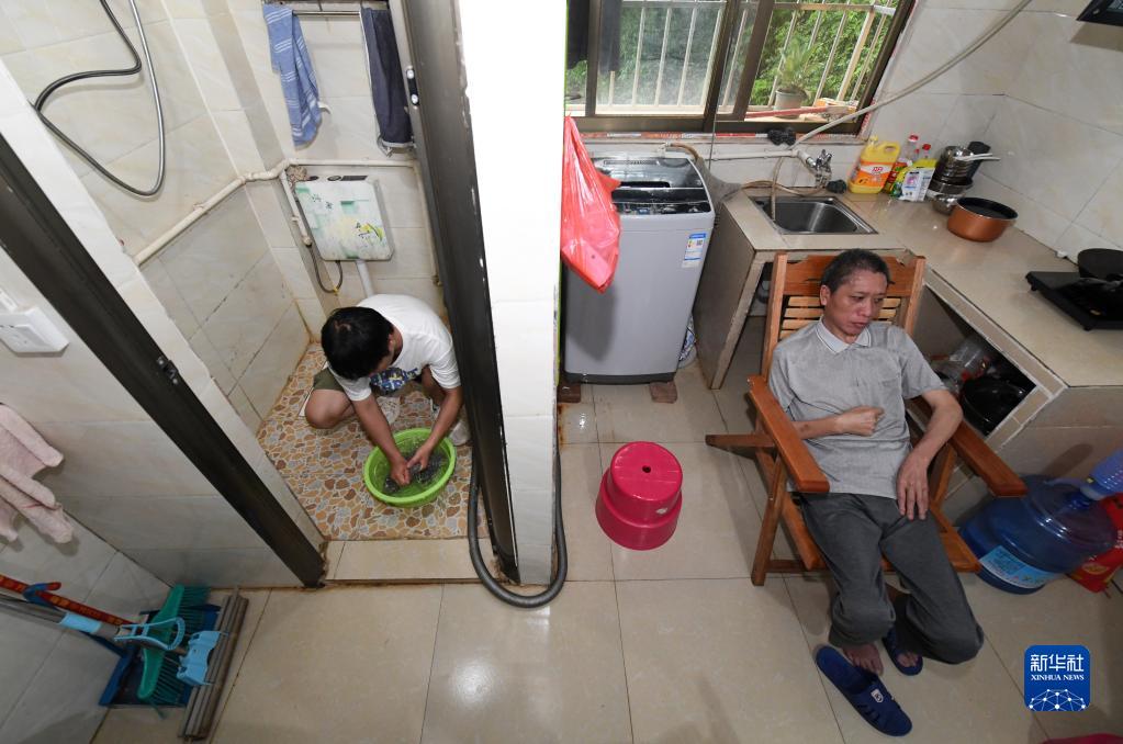 6月17日,在廣西南寧,袁東旺在學(xué)校附近的出租房里洗毛巾。