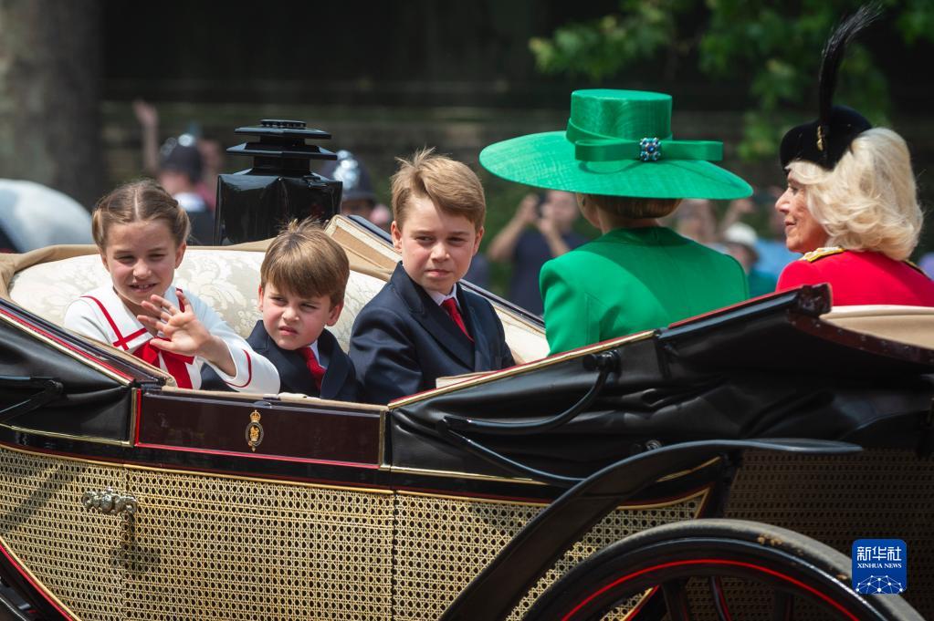 6月17日,在英國倫敦,喬治王子(左三)、路易王子(左二)、夏洛特公主(左一)乘坐馬車(chē)參加閱兵式。