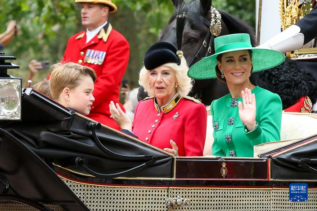 6月17日,在英國倫敦,王后卡米拉(中)、凱特王妃(右)、喬治王子(左)乘坐馬車(chē)參加閱兵式。