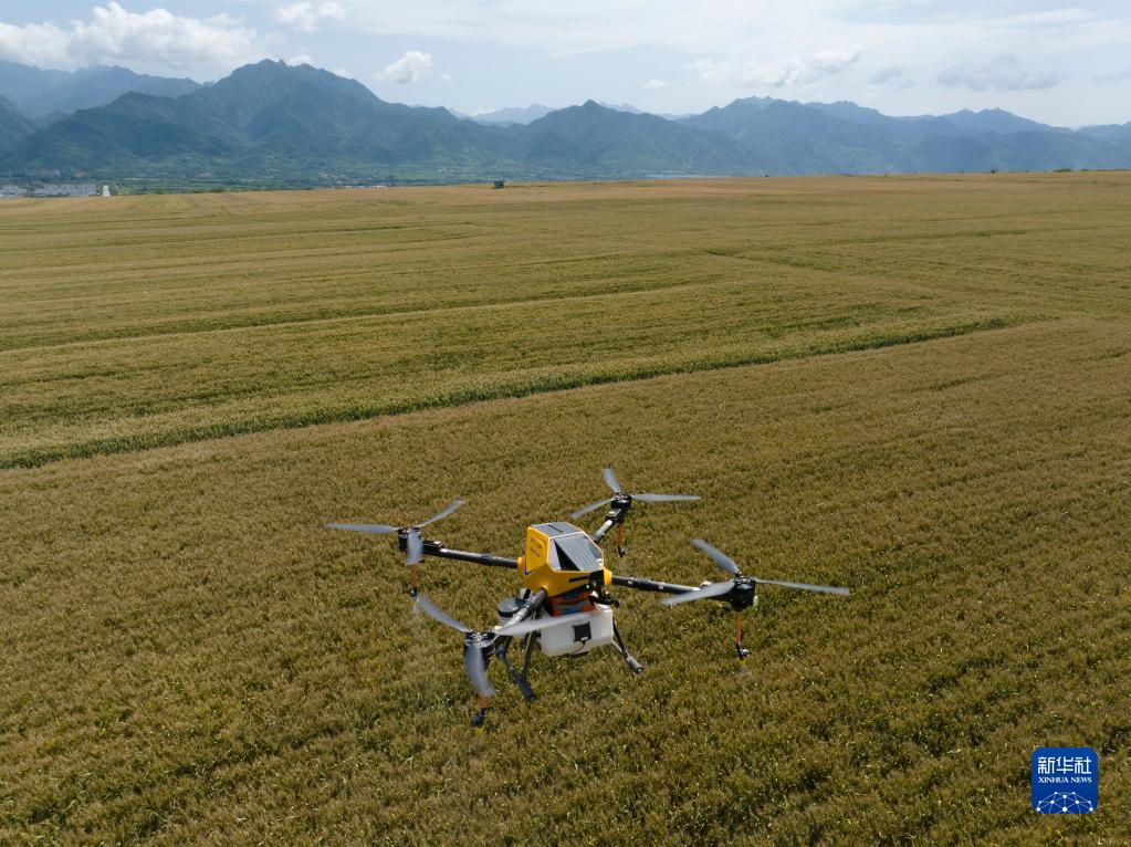 長(cháng)豐農機專(zhuān)業(yè)合作社的農機手在雨歇期間,操作植保無(wú)人機,在麥田內噴灑抗麥穗發(fā)芽藥劑,應對連陰雨對收獲造成的不利影響(5月30日攝,無(wú)人機照片)。