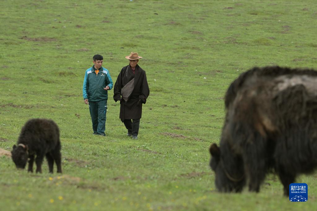 哈弄奪機(左)來(lái)到一名牧民的放牧點(diǎn)了解牦牛生長(cháng)情況(6月16日攝)。