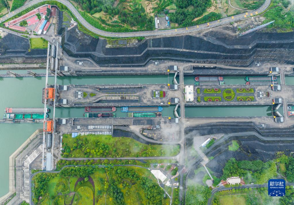 6月18日,船舶有序通過(guò)三峽雙線(xiàn)五級船閘(無(wú)人機照片)。