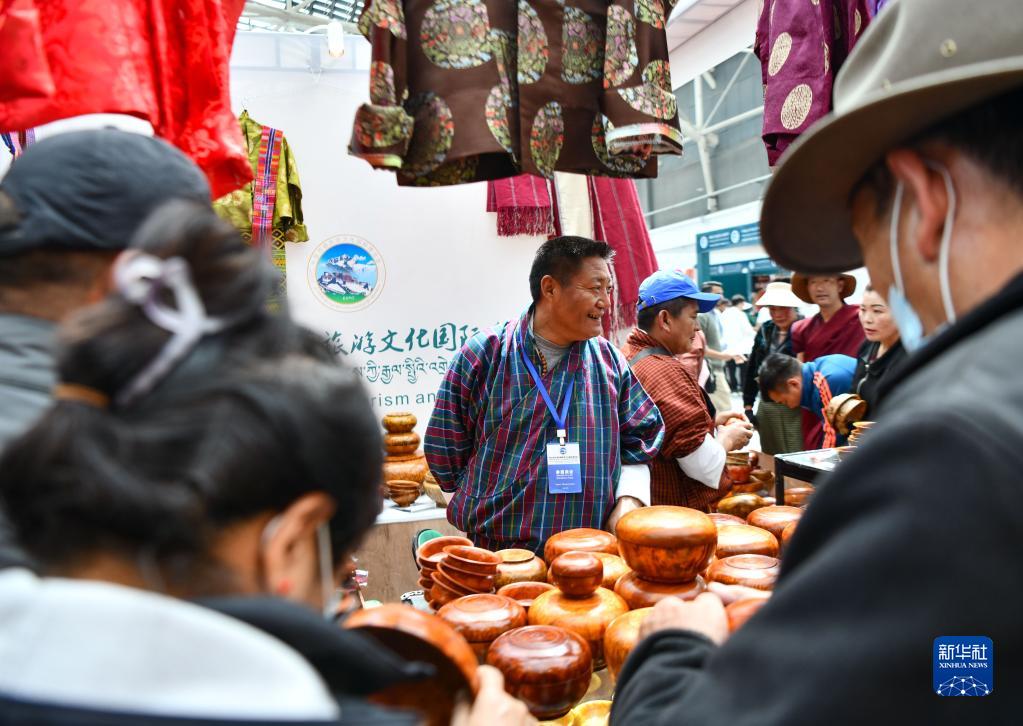 展會(huì )上的不丹商人向顧客銷(xiāo)售不丹服裝和木碗(6月18日攝)。