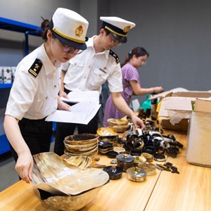 6月19日,在長(cháng)沙國際會(huì )展中心,長(cháng)沙海關(guān)所屬星沙海關(guān)關(guān)員在核對單貨。