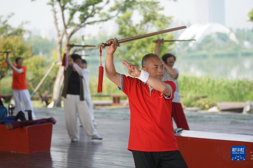 市民在揚州運河三灣風(fēng)景區晨練(6月15日攝)。