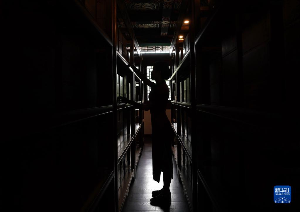工作人員在揚州文匯閣內維護《四庫全書(shū)》(6月15日攝)。