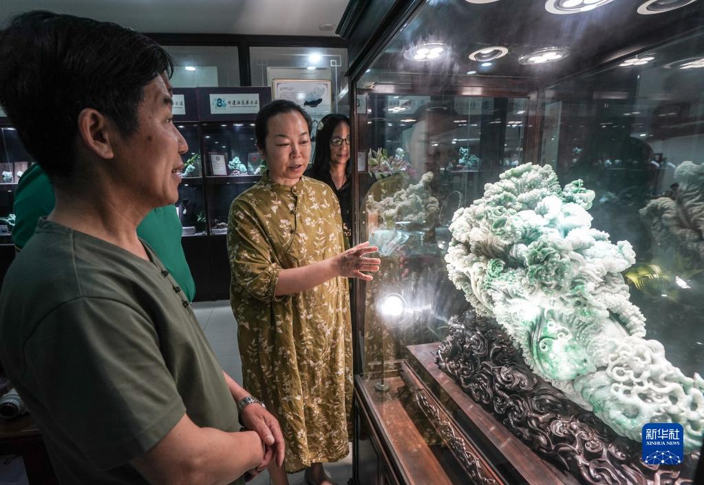 江蘇省文化遺產(chǎn)項目揚州玉雕代表人時(shí)慶梅(右)在工作室與工藝美術(shù)師們交流(6月15日攝)。