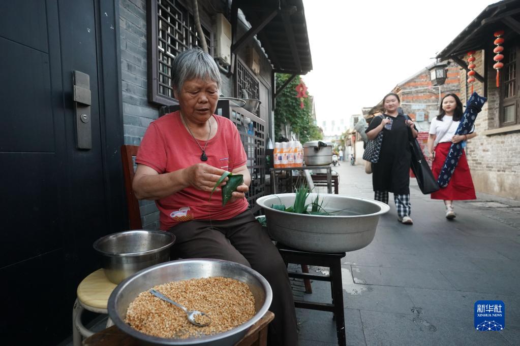 居民在揚州仁豐里包粽子(6月14日攝)。