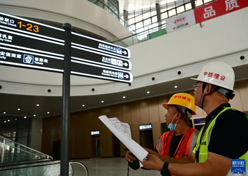 6月19日,施工方在即將竣工的福廈高鐵新建廈門(mén)北站候車(chē)大廳里排查設施安裝。