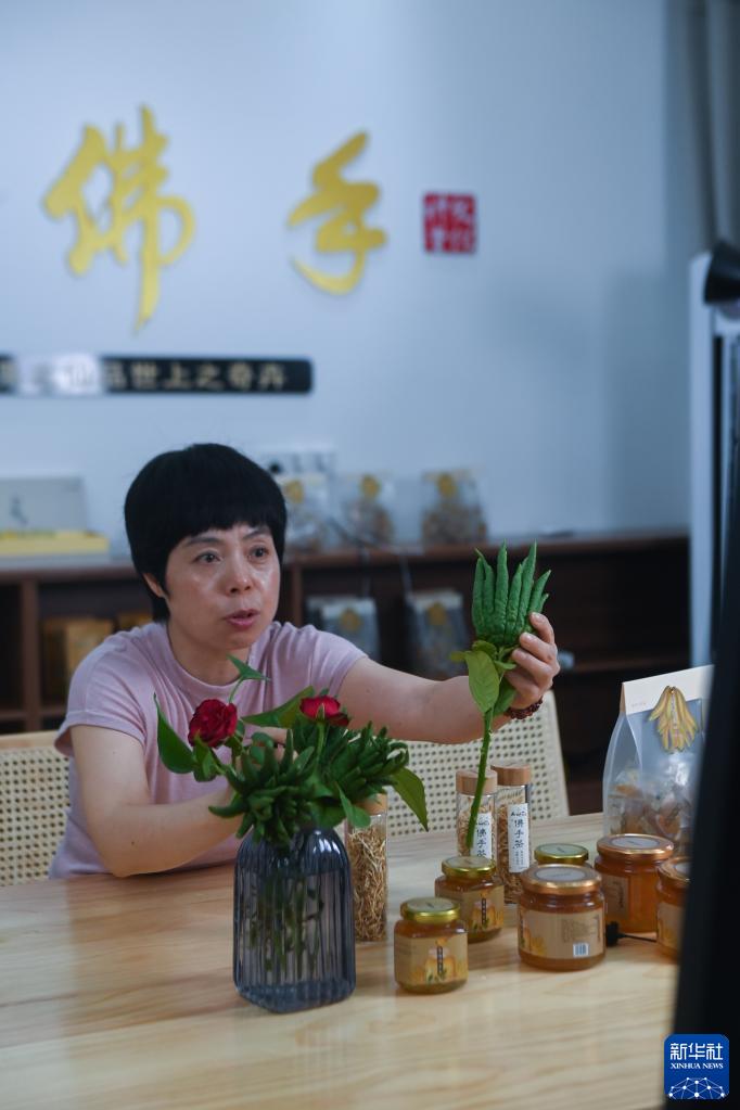 6月20日,在金華市金東區赤松鎮北山口村文旅會(huì )客廳的直播間內,種植戶(hù)在直播銷(xiāo)售佛手青果以及佛手茶、佛手糕等相關(guān)衍生產(chǎn)品。