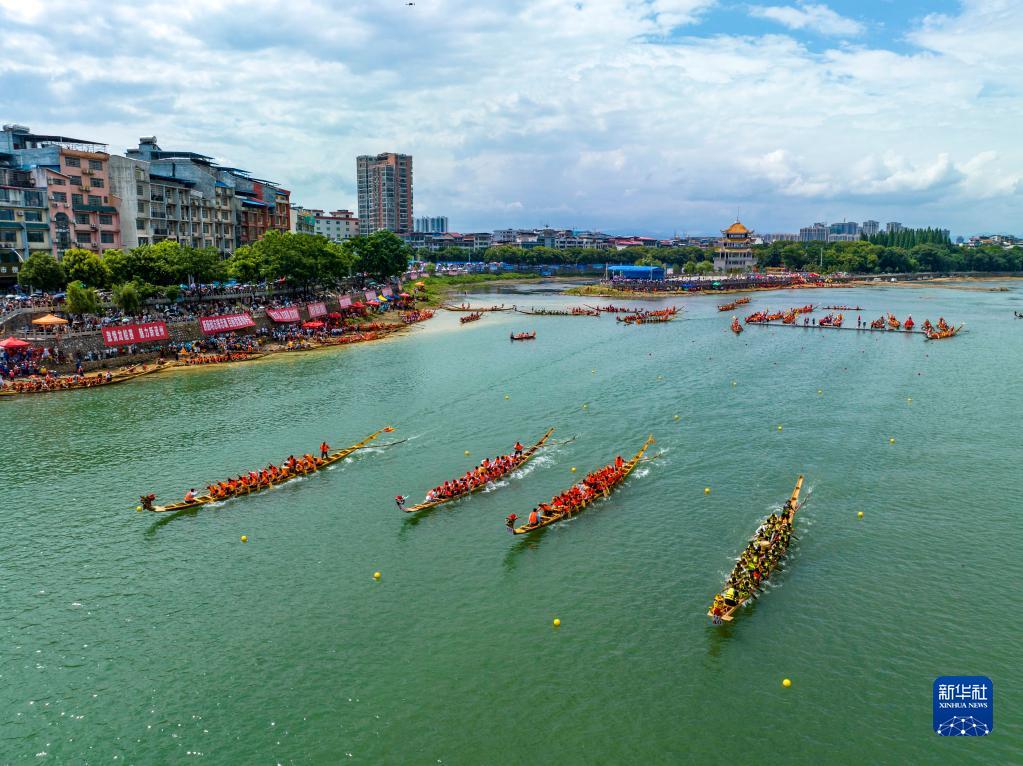 6月20日,龍船隊在湖南道縣瀟水河上競渡(無(wú)人機照片)。