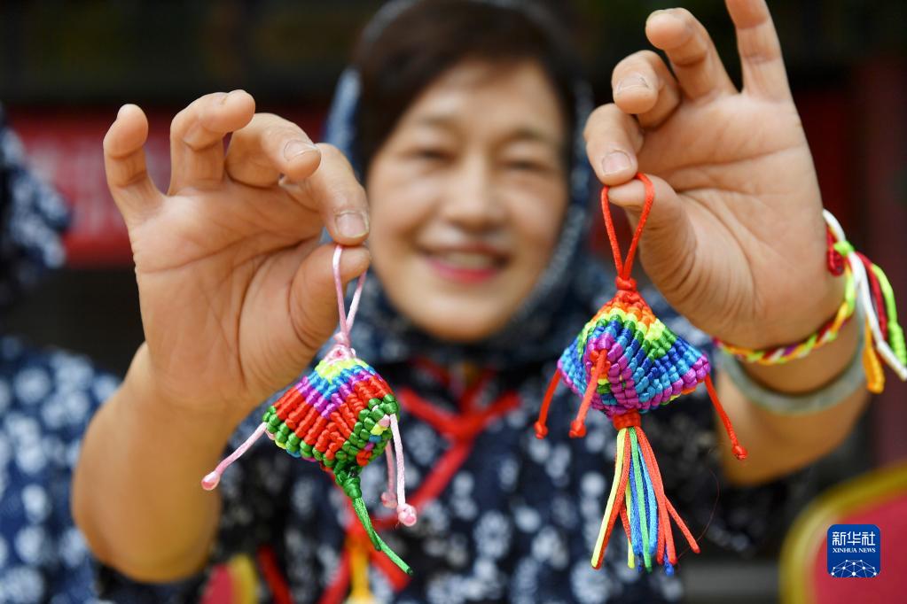 6月20日,在山東省青島市城陽(yáng)區紅島街道韓家民俗村,村民展示傳統手編彩粽。