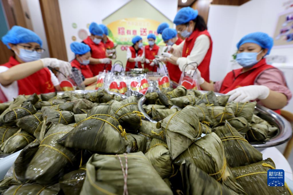 6月18日,在山東省棗莊市市中區總工會(huì )“戶(hù)外勞動(dòng)者驛站”,工會(huì )志愿者為戶(hù)外勞動(dòng)者包粽子。