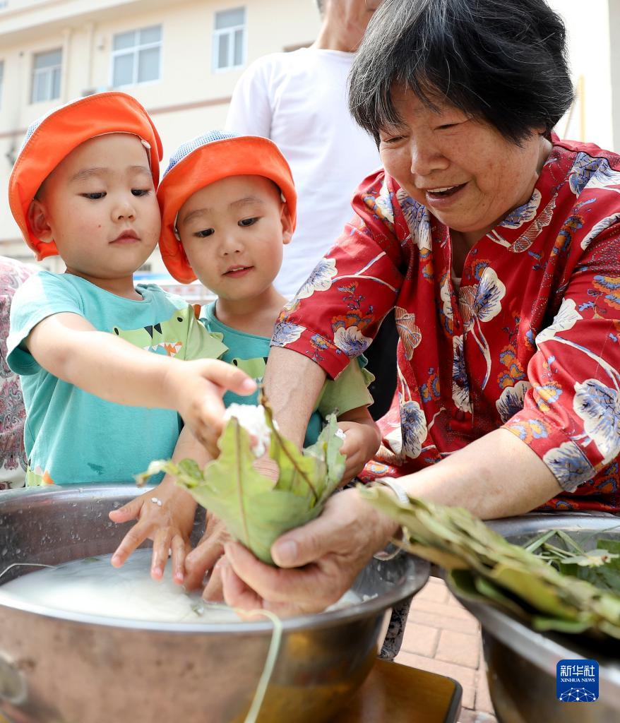 6月16日,在山東省青島西海岸新區隱珠街道黃土莊社區新時(shí)代文明實(shí)踐站,小朋友學(xué)習包粽子。