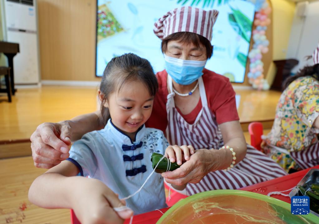 6月20日,在河南省開(kāi)封市新街口幼兒園,家長(cháng)跟小朋友一起制作粽子。