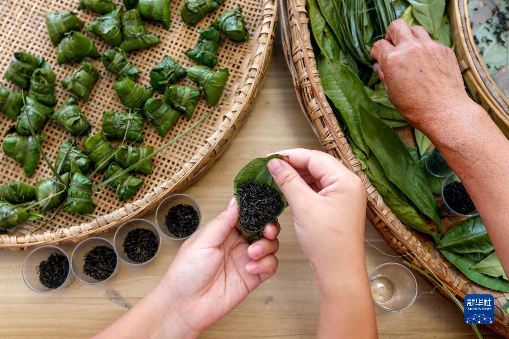 6月14日,在安徽省黃山市祁門(mén)縣平里鎮平里村,茶工把祁門(mén)紅茶作為“餡料”,用傳統包粽子的手法制作“粽茶”。