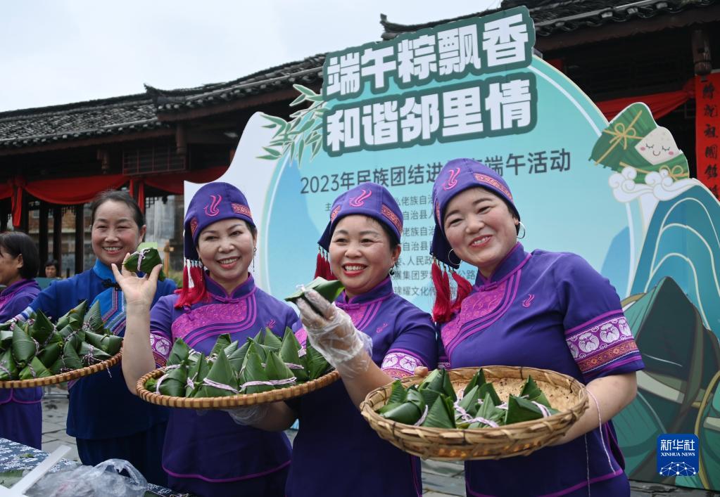 6月20日,在廣西羅城仫佬族自治縣東門(mén)鎮石圍古村舉行的“端午粽飄香,和諧鄰里情”活動(dòng)中,人們展示包好的粽子。