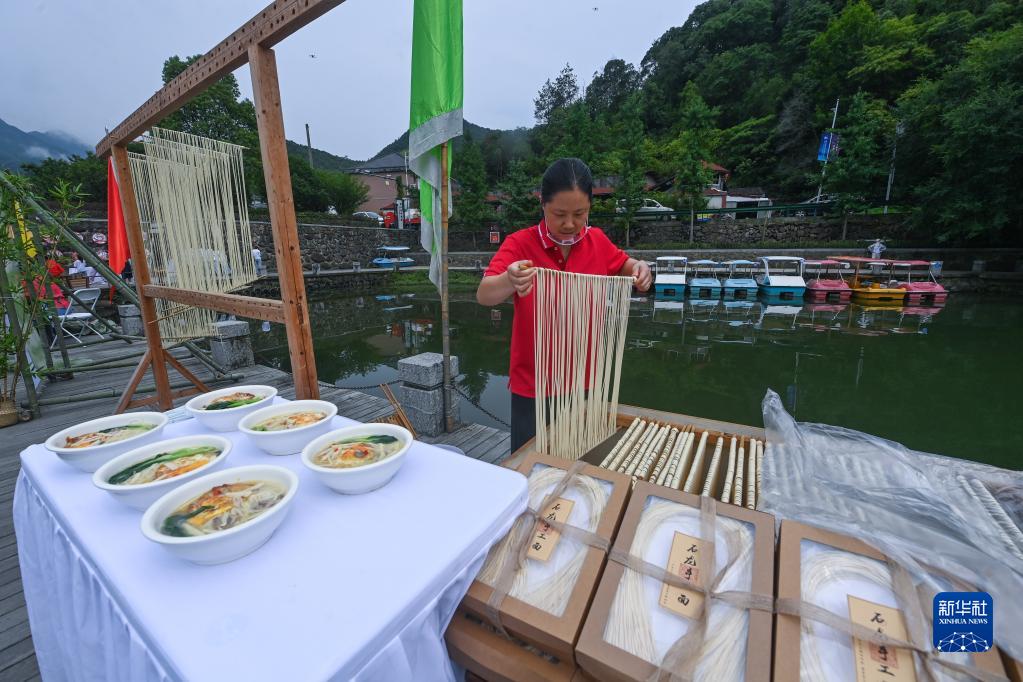6月21日,在端午文化活動(dòng)的共富集市上,村民在展示當地手工索面的制作技藝。