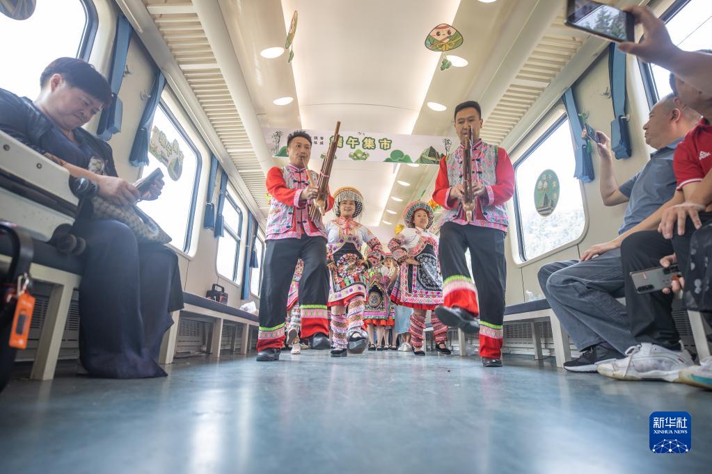 在“集市車(chē)廂”里,沿線(xiàn)村民將自家種的粽葉、艾草、菖蒲、糯米、蔬菜等農產(chǎn)品整齊擺放,供乘車(chē)旅客選擇購買(mǎi)。逛完“集市”,在“民俗體驗”車(chē)廂,旅客還可欣賞民族特色舞蹈、古箏彈奏、吉他彈唱等節目,親手制作粽子及艾草香包,體驗傳統文化民俗。