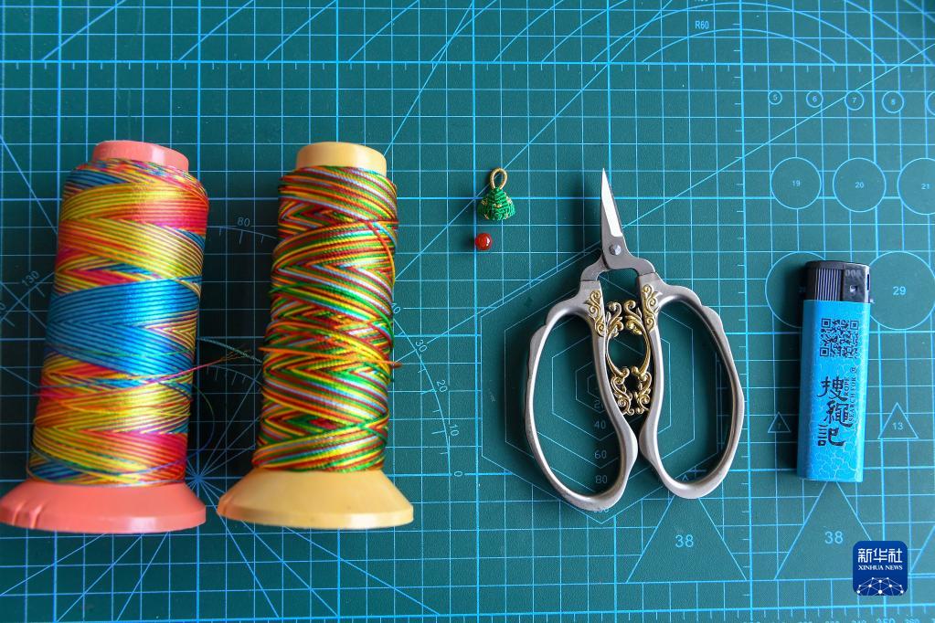 在位于吉林省長(cháng)春市的徐曉雪工作室內拍攝的制作繩結工藝品的材料和工具(6月20日攝)。