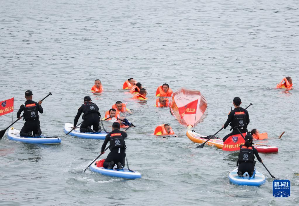 6月21日,工作人員在幫助落水的龍舟隊員。