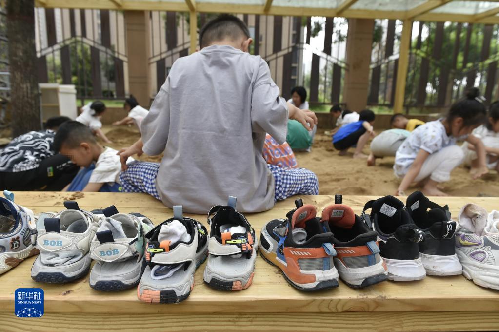 6月19日,在河南省鄭州市奇色花福利幼兒園,普通兒童和特殊需要兒童一起參加戶(hù)外活動(dòng)。