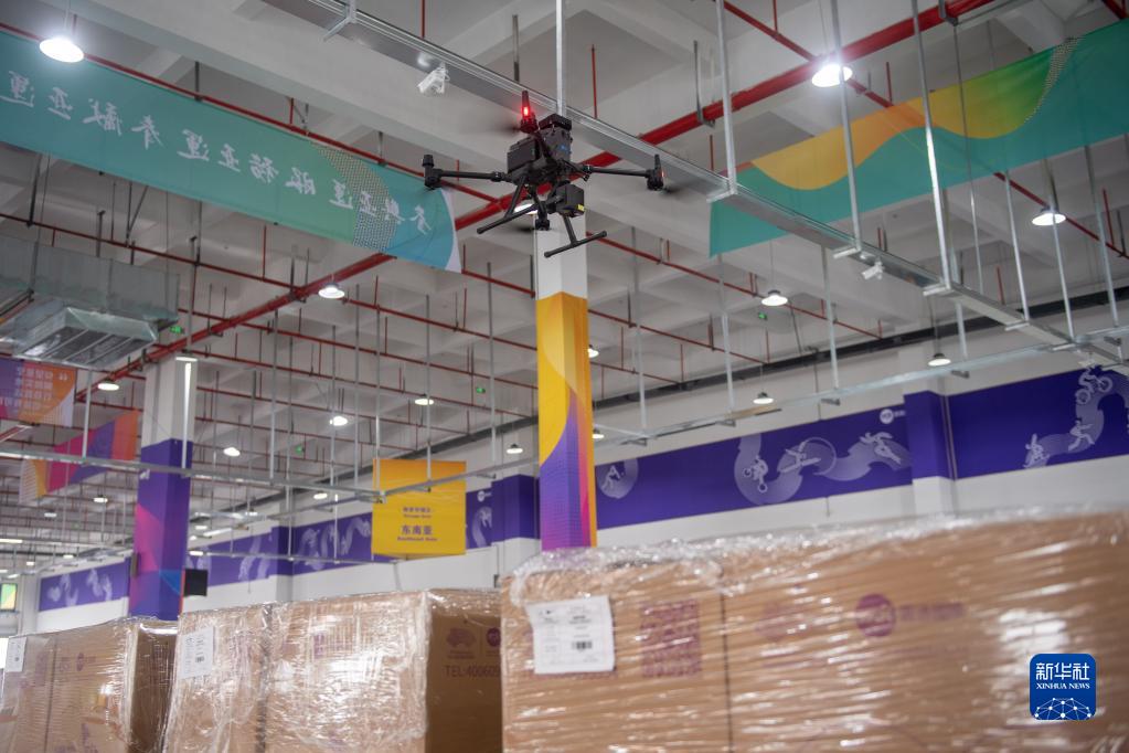 6月21日,工作人員使用無(wú)人機對第19屆杭州亞運會(huì )物流中心內的包裹進(jìn)行清點(diǎn)。
