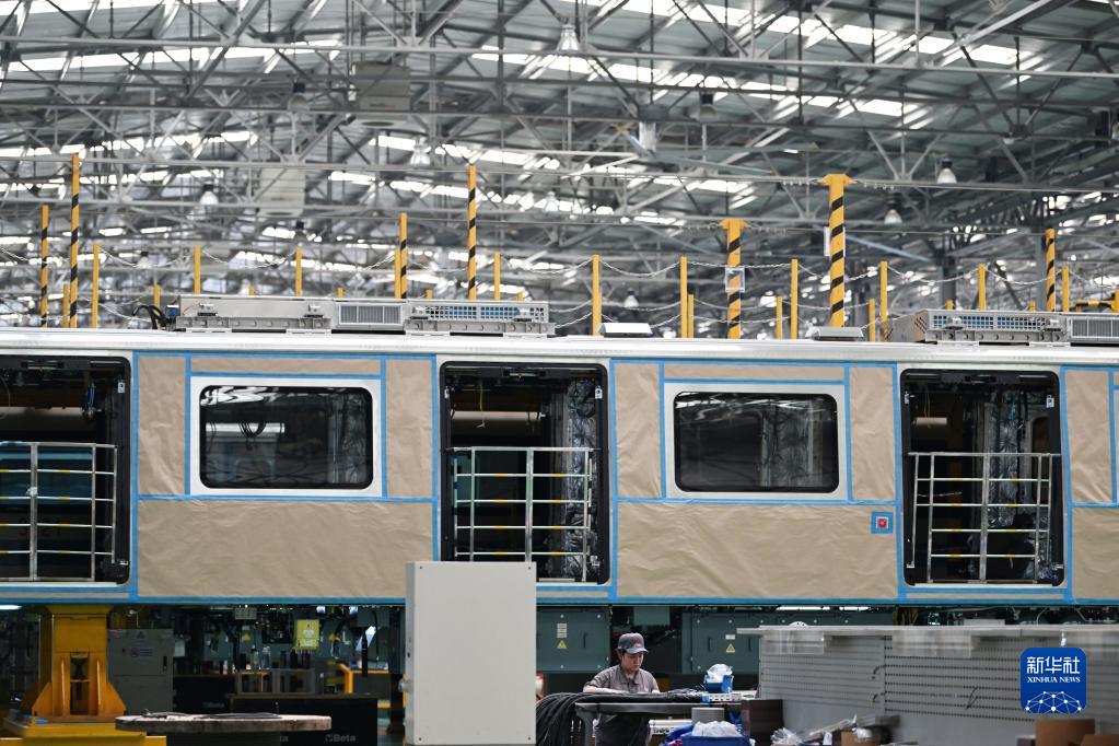 工作人員在天津中車(chē)唐車(chē)軌道車(chē)輛有限公司的組裝車(chē)間內進(jìn)行作業(yè)(6月20日攝)。
