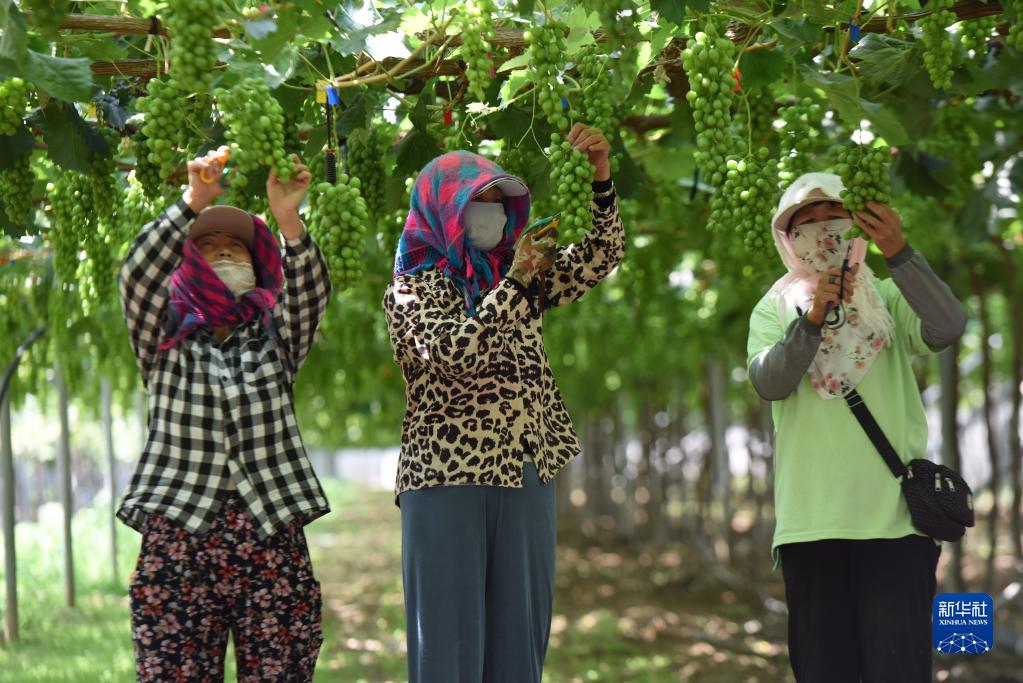 6月21日,在河北省懷來(lái)縣的豐禾葡萄基地,當地農民在進(jìn)行葡萄管理。