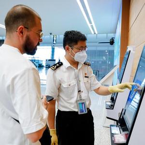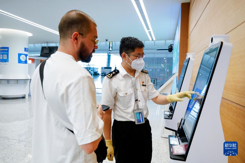 6月21日,在成都天府國際機場(chǎng),成都海關(guān)關(guān)員(右)指導一名外國旅客使用自助申報機進(jìn)行出境健康申報。
