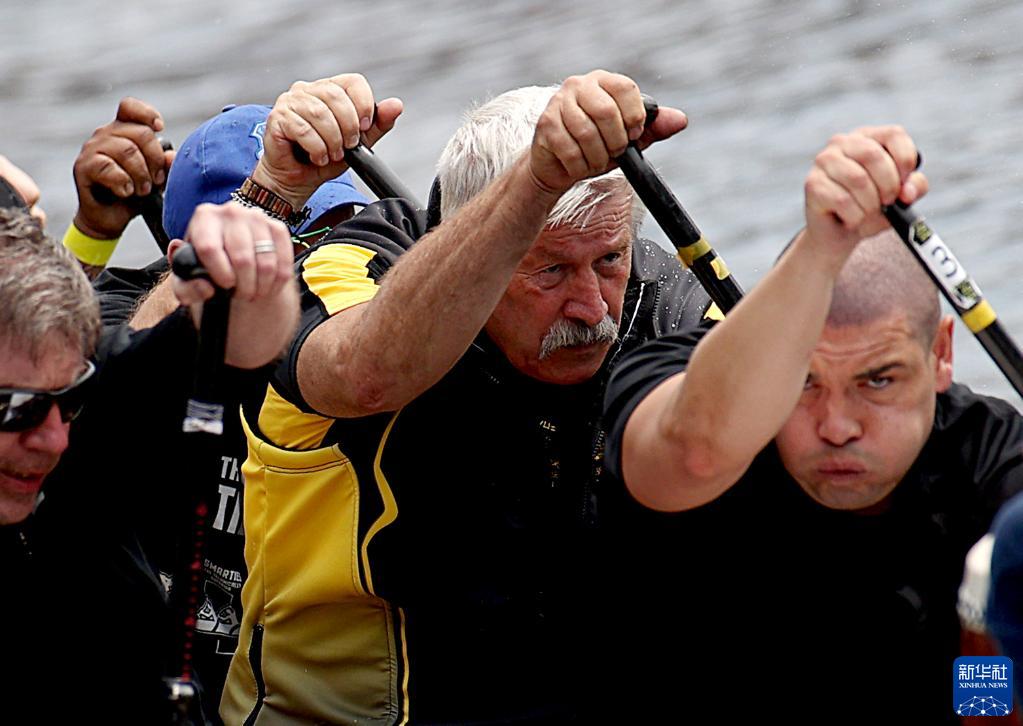 6月18日,戴維·邦斯(右二)和Amathus龍舟俱樂(lè )部其他選手在英國索爾福德市參加2023年全英中華端午龍舟會(huì )專(zhuān)業(yè)組比賽。