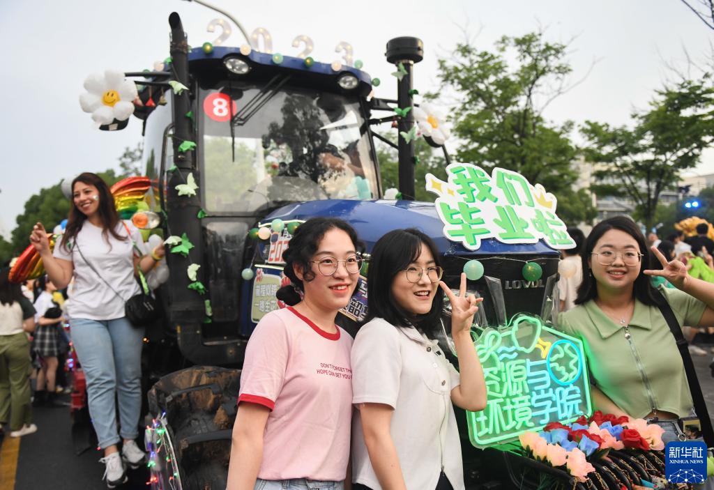 當日,為迎接畢業(yè)季,華中農業(yè)大學(xué)舉行了一場(chǎng)花車(chē)巡游,學(xué)生們簇擁著(zhù)由現代農機裝備組成的花車(chē)隊伍,在校園里巡游,慶祝畢業(yè)、致敬青春。